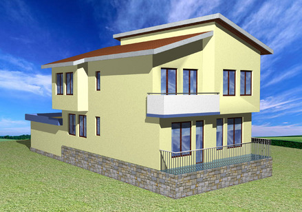 Характерни особености на проекта: Маломерен имот, композиция от прости обеми за създаване на благоприятни условия за улеснен строителен процес и безпроблемна експлоатация.
